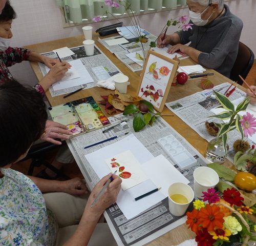 絵手紙教室が開催されました2025.10.3110月16日、レインボーハイツで絵手紙教室が開かれました。参加された皆様は、それぞれに秋の題材をテーマに筆を走らせ、個性豊かな作品を仕上げておられました。 完成した絵手紙は、毎年恒例の「趣味の作品展」に展示いたします。ぜひ皆様の温かい感性あふれる作品をご覧ください。 お知らせ一覧へ