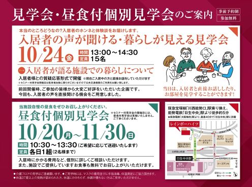 10月開催セミナーのお知らせ2025.10.01 今月もセミナーを開催します!! 今月のセミナーは、実際にレインボーハイツにご入居されていらっしゃる方との茶話会や、お部屋の見学ができるセミナーでございます。 次の住処に迷われていいらっしゃる方へむけた、ご自身が決められた時のポイントや、実際入居してみてどうかなど、ざっくばらんに聞いていただける機会となっています。 お気軽にお電話にてお問合せください。 レインボーハイツ事務室 山下まで(072-766-1188) お知らせ一覧へ